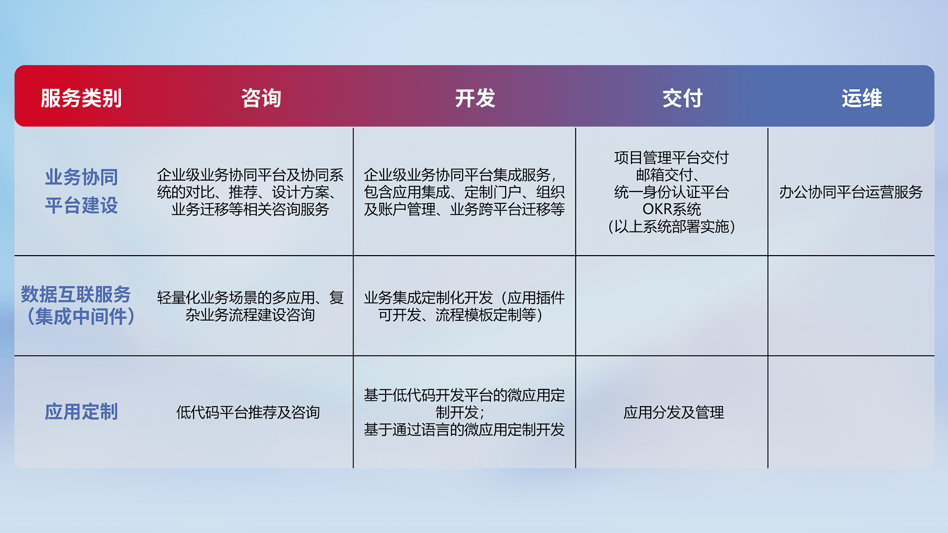 针对钉钉、、企微、、IDaas等平台级产品提供产品的规划、、、方案、、交付、、、、定制化开发等服务,,,实现如统一协同办公、、、智能客户服务、、混合会议管理、、、智能数据查询、、、、等业务场景,,实现数字化转型。。。